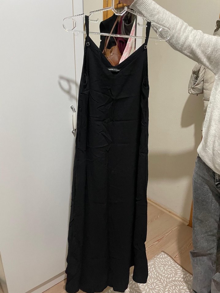 Siyah keten kumaştan, uzun boylu, V yakalı ve kolsuz elbise. Gevşek kesimli ve drapeli, gotik tarzı yansıtır cepli kumaş elbise.