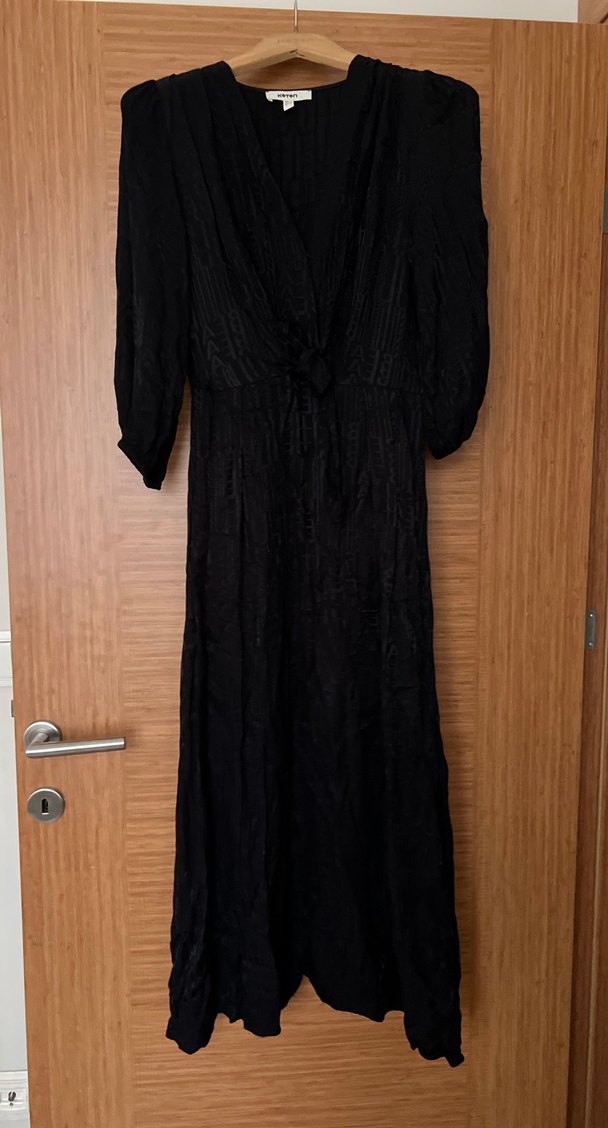 Siyah renkte, keten kumaştan, V yakalı ve uzun kollu, dökümlü tasarıma sahip bol kesim uzun elbise. Goth ve bohem tarzlara uyumlu.
