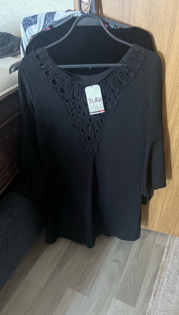 Siyah, V yakalı ve uzun kollu bluz, yakasında fırfır detayları bulunur. Sentetik kumaştan, rahat kesimlidir. Marka: Fulla.