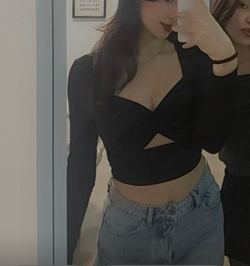 Siyah denim kumaştan, V yaka ve yırtmaç detayı bulunan, uzun kollu ve normal boyda, günlük kullanıma uygun, trend goth tarzda fitted crop top. 34 beden