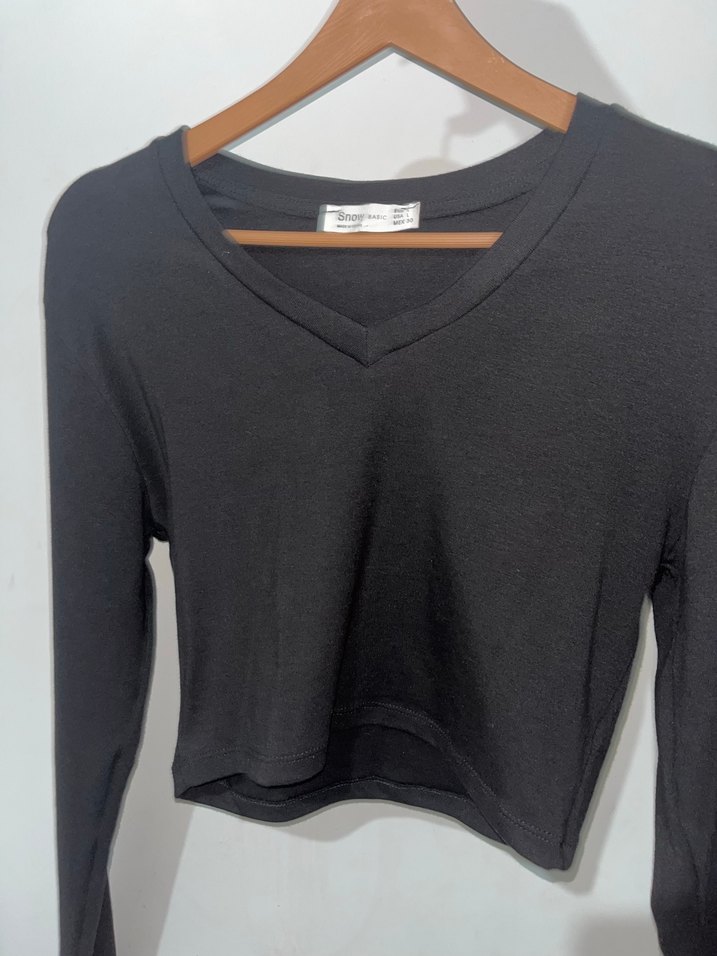 V yaka ve uzun kollu, düz siyah renkli, sentetik kumaştan yapılmış, vücuda oturan kadın crop top. Minimalist ve sokak modası tarzında, günlük kullanım için uygundur. ✨ Ürün çok güzel fakat biraz kısa o yüzden kullanamadım sadece denemek için kullanıldı
