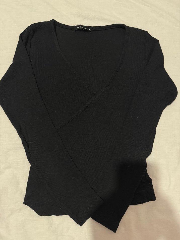 Uzun kollu, V yakalı siyah dar kesim bluz, sentetik kumaştan üretilmiştir. Minimalist gotik tarzı ve rahat kullanıma uygundur.