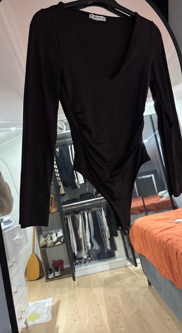 Siyah drapeli ön detaya sahip, V yaka ve uzun kollu, vücuda oturan bluz. İpeksi kumaştan üretilmiş, günlük sokak stili için cesur athleisure havasında.