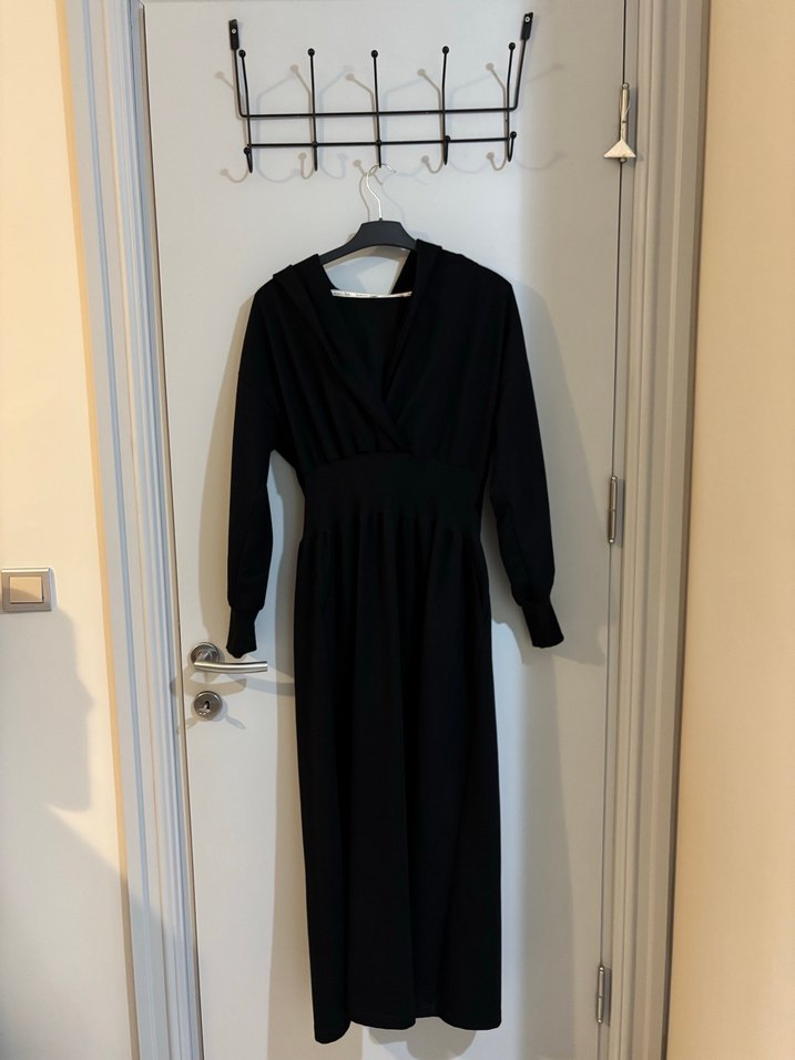 Siyah renkli, V yaka ve uzun kollu drapeli uzun elbise. Rahat kesimli ve sentetik dokulu kumaştan, minimalist ve gotik tarzlara uygun. Günlük kullanıma uygun şık parça. Neredeyse hiç giyilmemiş 38 beden kıyafet fazlalığından dolayı satıyorum.