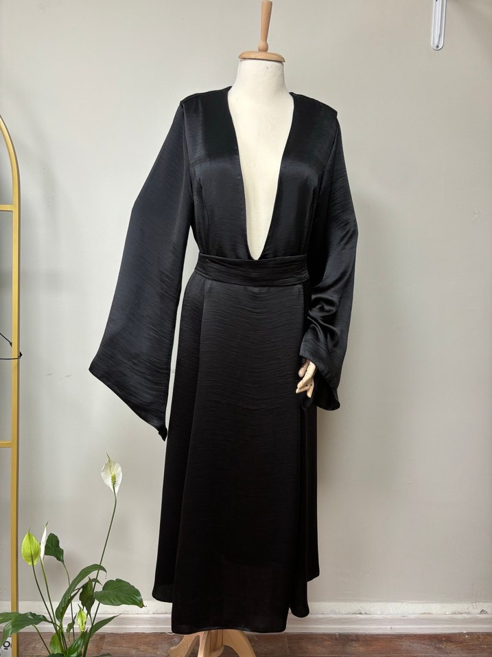 Kişiye özel dikim yapıyoruz Siyah uzun elbise, bambu ipek kumaştan, V yakalı ve bol kesimdir. Uzun, drapeli kolları ile gotik ve avangart bir tarz sunar.