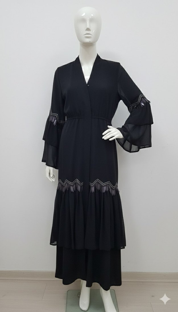 Siyah uzun abaya, V yaka ve uzun kollu, fırfır detaylıdır. sadece iki kez giyildi özel dikim standart beden