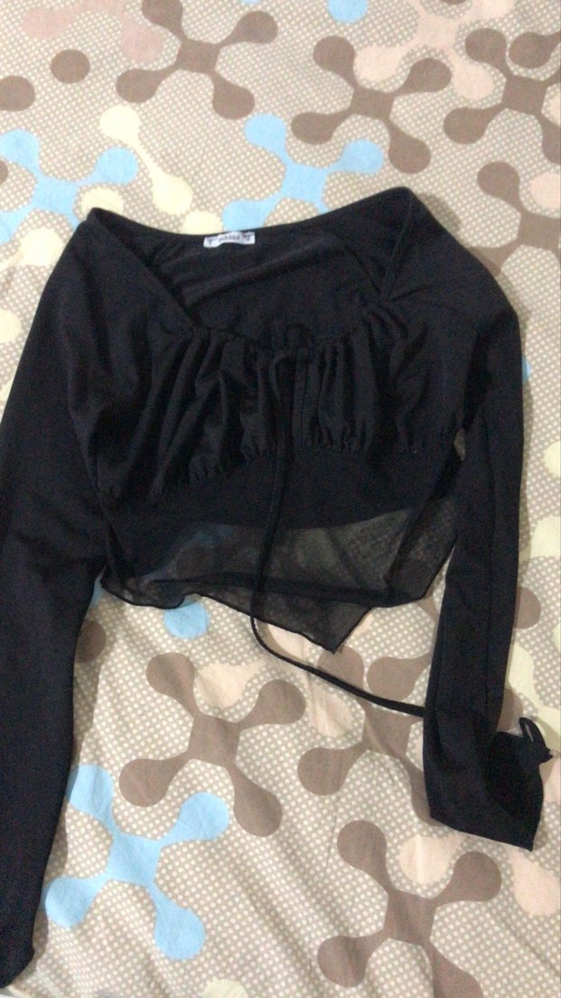 Siyah, uzun kollu ve V yakalı bu fitted bluz, drapeli detaylara sahiptir. Midi boyu ve hafif transparan sentetik kumaşıyla trend günlük stile uygundur.