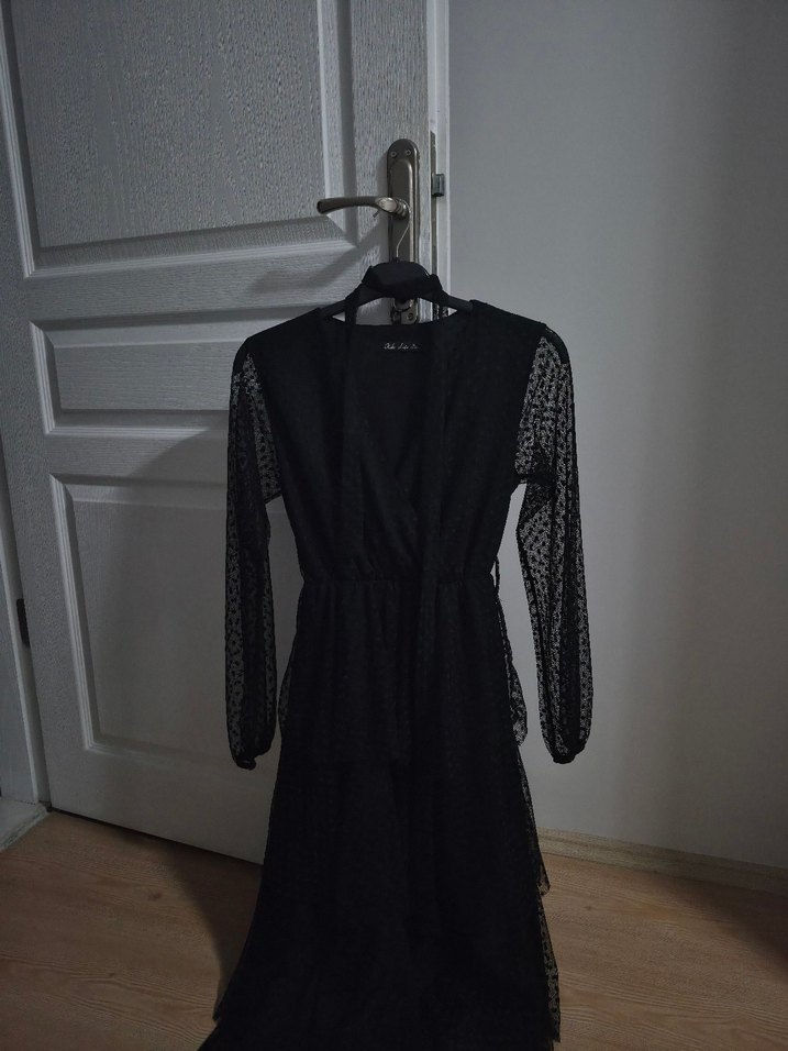 Siyah renkte, V yakalı ve uzun kollu, drapeli tasarıma sahip dar kesim uzun elbisedir. Yumuşak sentetik kumaştan yapılmıştır, günlük kullanıma uygundur.