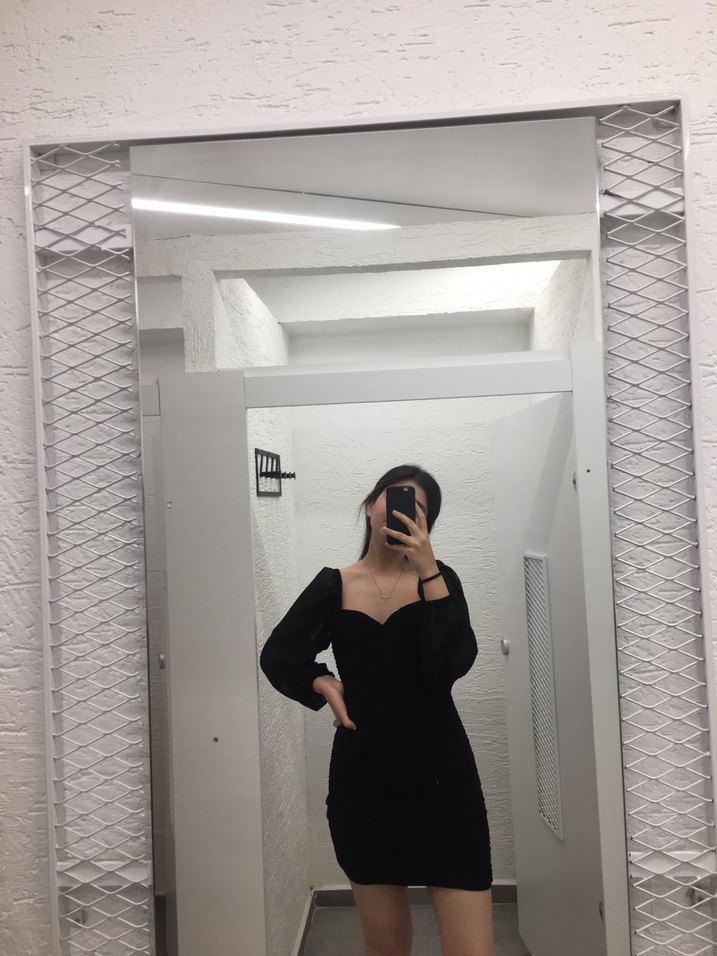 Siyah, uzun kollu ve V yakalı bu mini elbise, ipeksi kumaşı ve oturan kesimiyle gotik tarzda şık ve iddialı bir görünüm sunar.