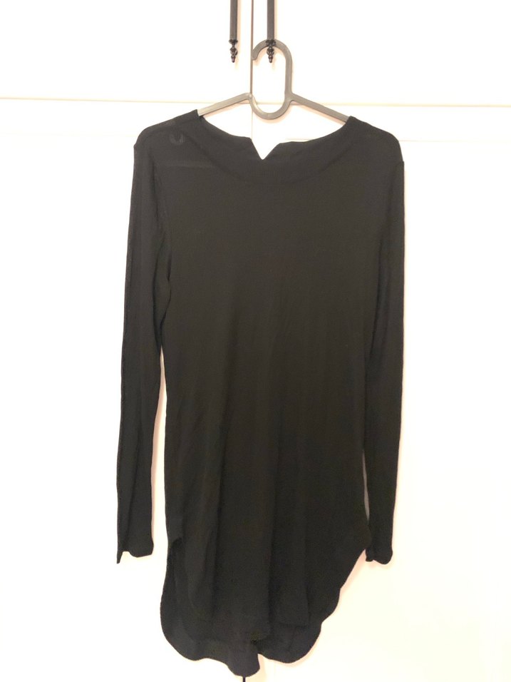 Siyah, keten kumaştan yapılmış, uzun kollu ve V yakalı, bol kesim hamile tuniği. Minimalist goth tarzıyla günlük kullanıma uygun midi boyda rahat bir parça.