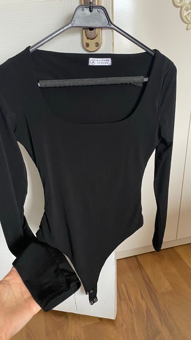 Siyah, V yaka ve uzun kollu, vücuda oturan kadın bluz.