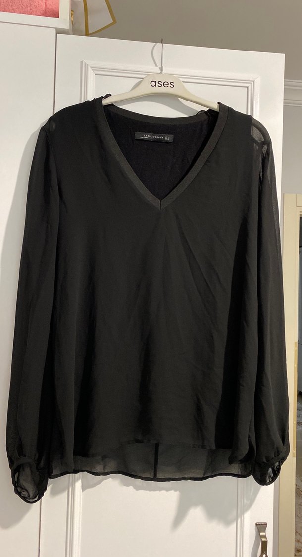 Siyah, V yaka ve uzun kollu bu bluz, rahat kesimi ve normal boyuyla ofis için uygundur. İpeksi kumaştan üretilmiş, zahmetsiz şıklık sunar.