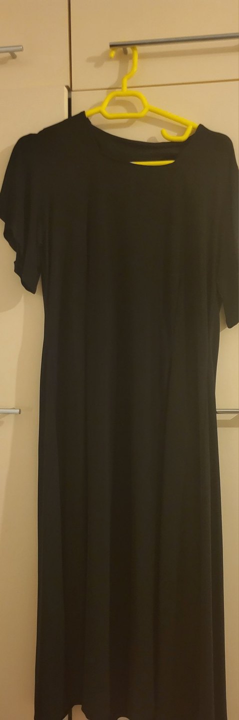 Siyah, V yakalı, kısa kollu, dökümlü, bol kesim, ipeksi kumaştan uzun elbisedir. Gotik ve avangart tarzda, ofis kullanımı için uygundur.