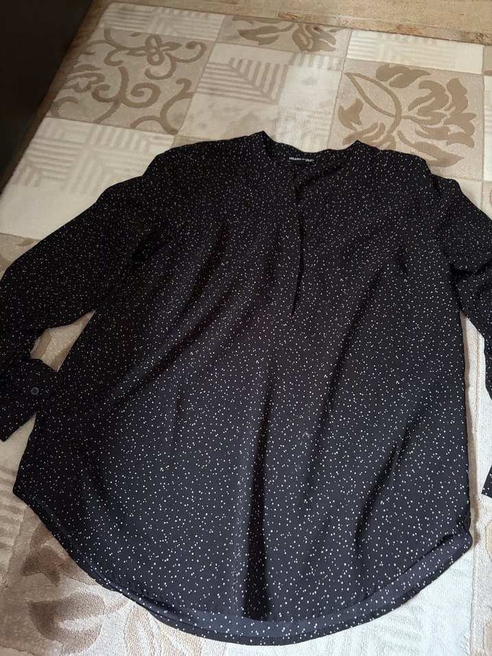 Siyah, düğmeli ve ince puantiyeli, V yakalı, uzun kollu, bol kesim kadın gömleği. Günlük kullanıma uygun.
