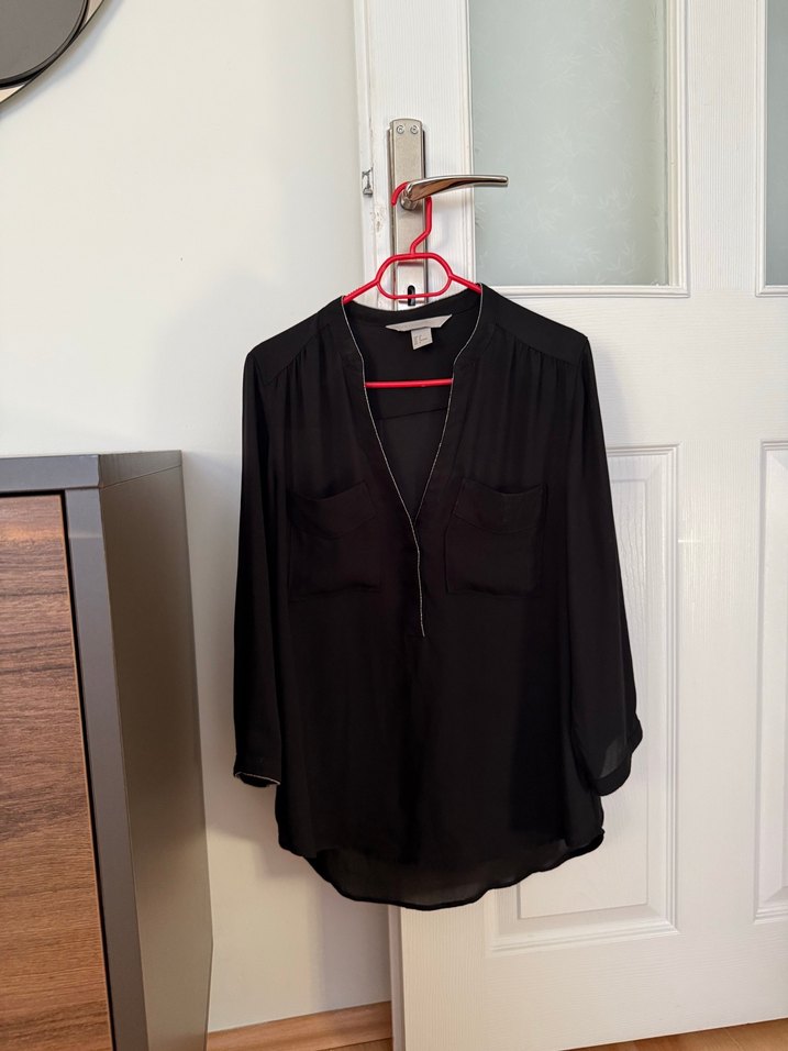 Siyah, V yaka ve uzun kollu kadın gömleği, bol kesim ve satenimsi dokuda. Bel detaylı, gündelik ve gotik tarz için uygundur.