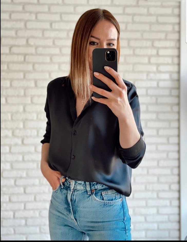 Siyah zaten kumaştan, V yaka ve uzun kollu, bol kesim kadın gömlek. Günlük kullanıma uygun, rahat ve şık bir sokak stili sunar.