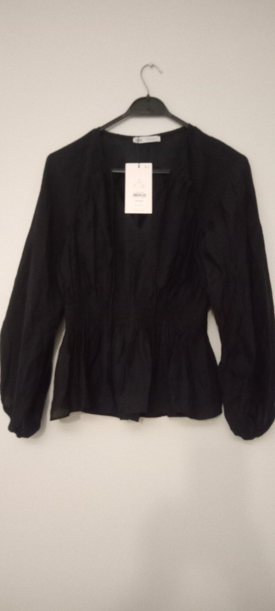 Siyah keten kumaştan, uzun kollu, V yaka ve düğmeli detaylı bol kesim bluz, ofis için uygun.