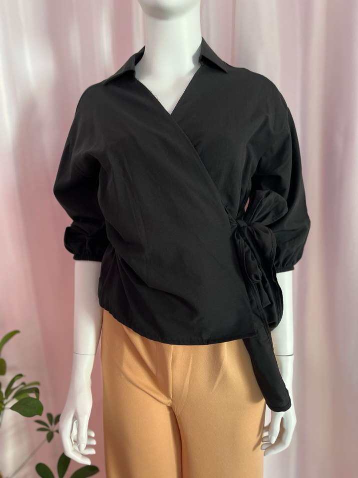 Siyah uzun kollu, V yakalı ve kuşaklı bel detaylı, bol kesim ve midi uzunlukta, sentetik kumaştan kadın gömlek. Ofis için uygun. İnstagram @swan_butikk s M l beden mevcuttur