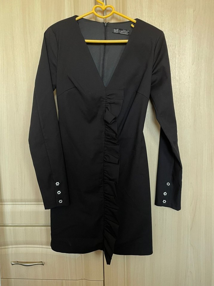 V yaka ve uzun kollu siyah midi elbise, ön kısmında fırfır detayıyla. Manşetlerde küçük çiçekli düğme detayları içerir. Blazer kumaşında ceket elbise. Vatkalı. Zara marka. XS beden.