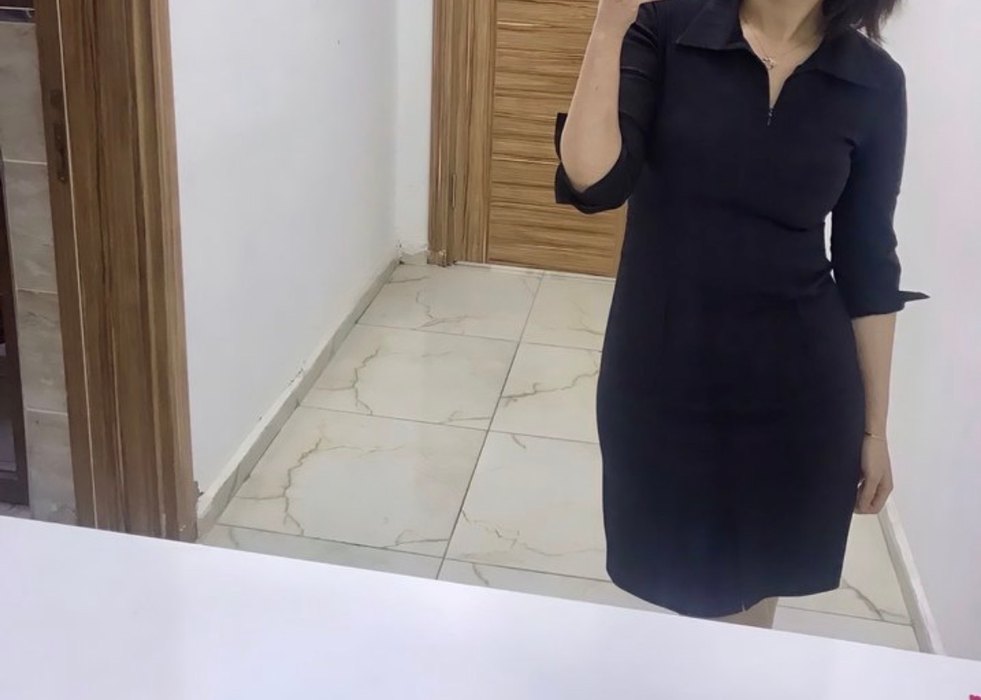 Siyah midi elbise, V yaka ve uzun kollu olup, düz ve desen içermeyen tasarıma sahiptir. Sentetik kumaştan yapılmış, ofis için uygun ve şık bir görünüme sahiptir.