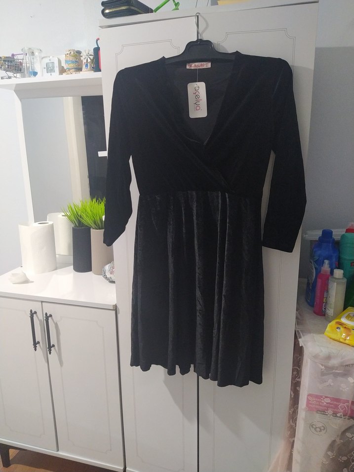 Siyah midi elbise, uzun kollu ve V yakalıdır. rahat kesim ve koyu gotik tarzıyla romantik akşamlar için uygundur.