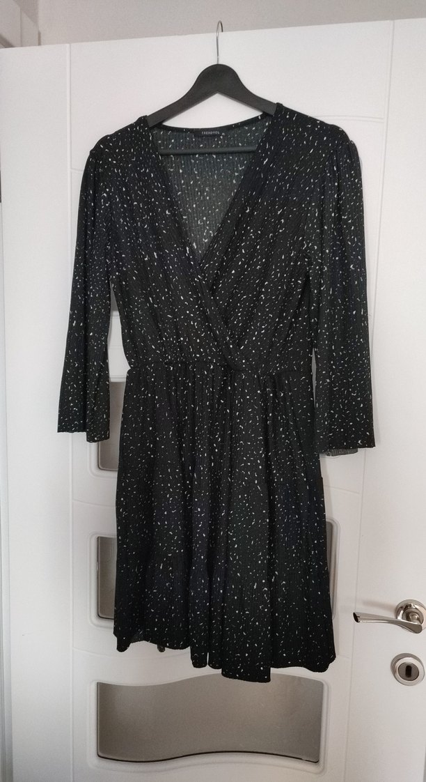 Siyah midi elbise, bol kesim ve drapeli detaylara sahip. V yaka, uzun kollu ve hafif batik desenlidir, romantik akşamlar için uygundur.