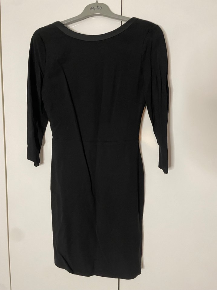 Siyah, v yaka, uzun kollu ve drapeli detaylı, vücuda oturan midi elbise. Ofis için uygun, gotik tarzda bir model.