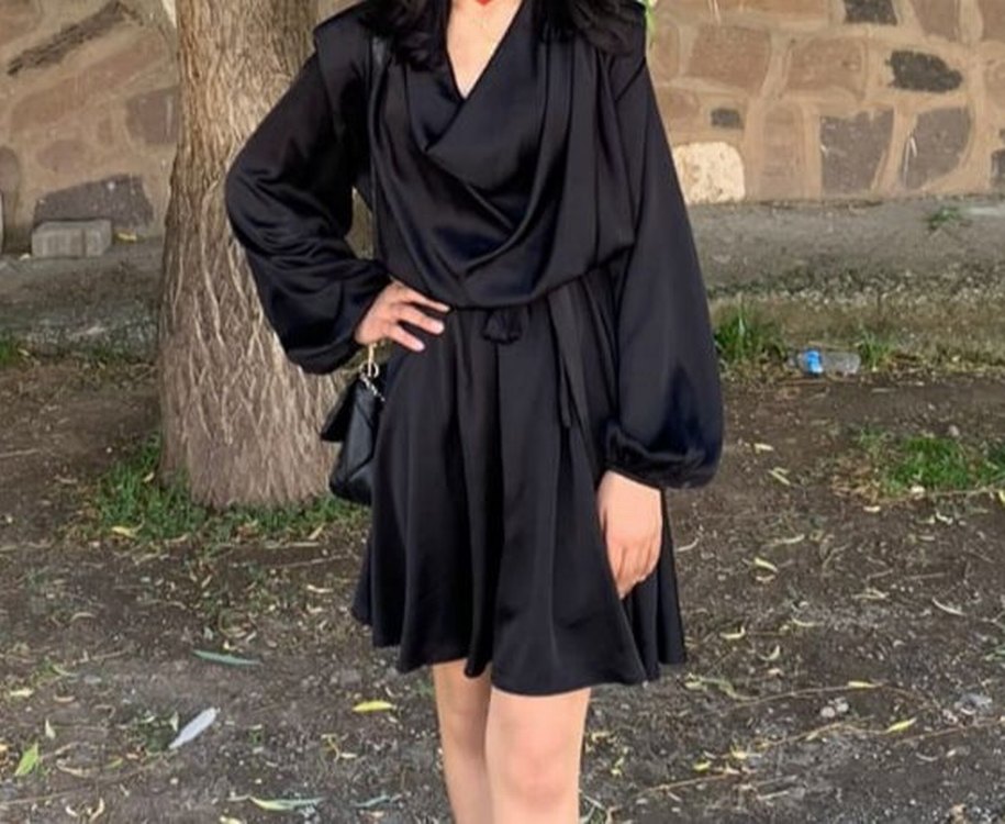 Siyah midi elbise, V yaka ve uzun kollu, bol kesim ve drapeli detaylarla gotik tarzda tasarlanmıştır. Günlük kullanıma uygundur.