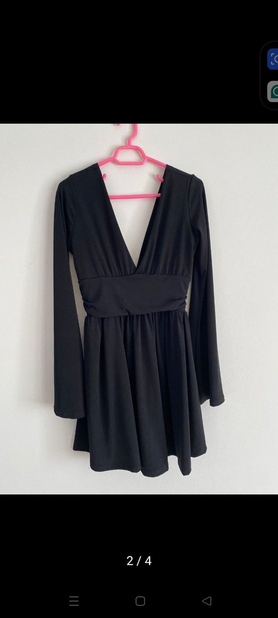 Siyah gece elbisesi, derin V yakalı ve uzun kollu, beli oturan, etek kısmı ise mini ve dökümlü. Cesur gotik tarza uygun, romantik geceler için ideal.