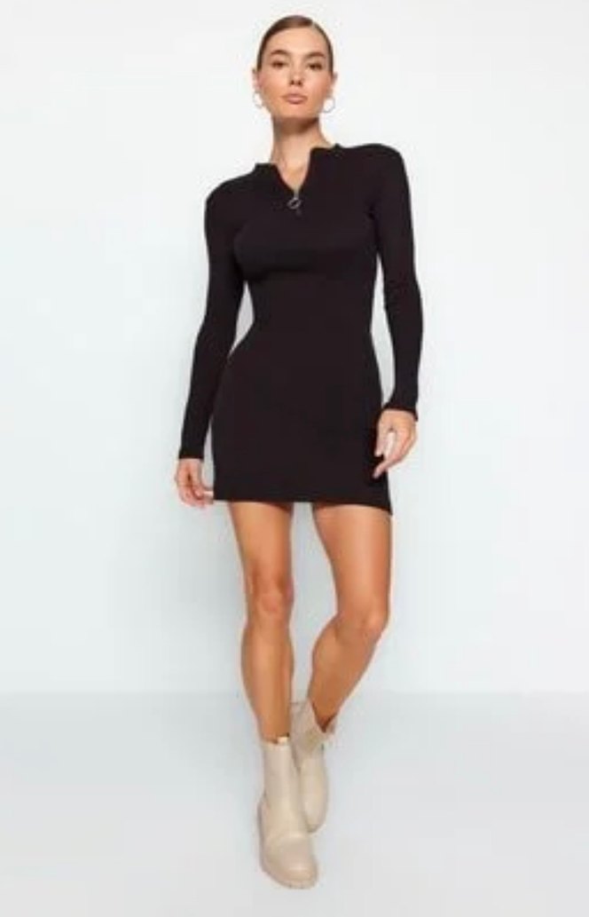 Siyah, uzun kollu, V yakalı, vücuda oturan mini elbise. Düz tasarımı ve sentetik kumaşıyla günlük şıklık sunar.