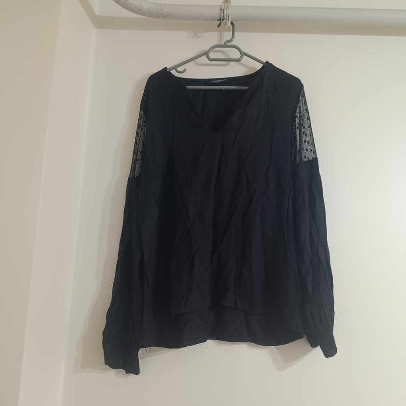 Siyah renkli, keten kumaştan üretilmiş, V yakalı ve uzun kollu salaş bluz. Kollarında dantel detaylar ve drape tasarım bulunur, gotik stile uygun.