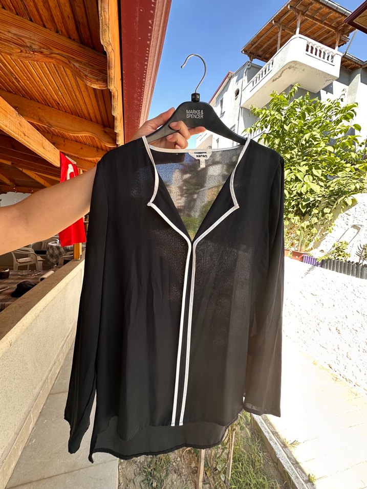 Siyah, V yakalı, uzun kollu, salaş kesim kadın bluz. Tül gibi kumaştan, drapeli, günlük kullanıma uygun.