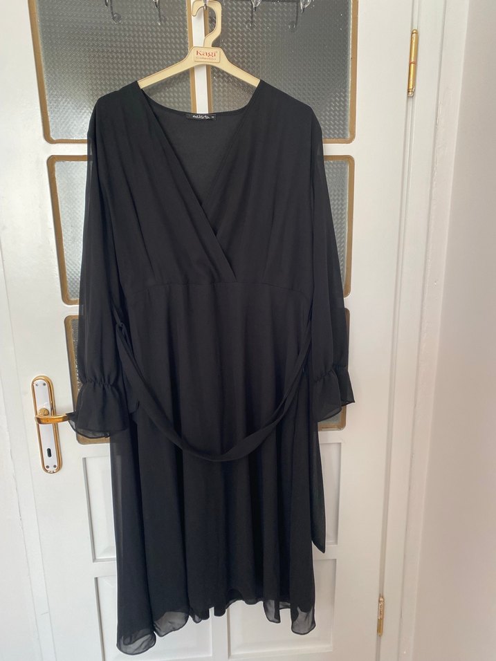 tüllüdür Siyah renkte, V yaka ve uzun kollu, salaş kesim uzun elbise. Sentetik kumaştan olup, drapeli tasarımıyla ofis ortamına uygundur.