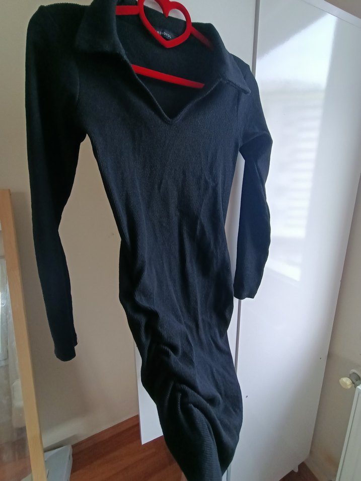 V yaka ve uzun kollu, siyah triko elbise, drapeli tasarımıyla tarzını yansıtır. s m uyumlu