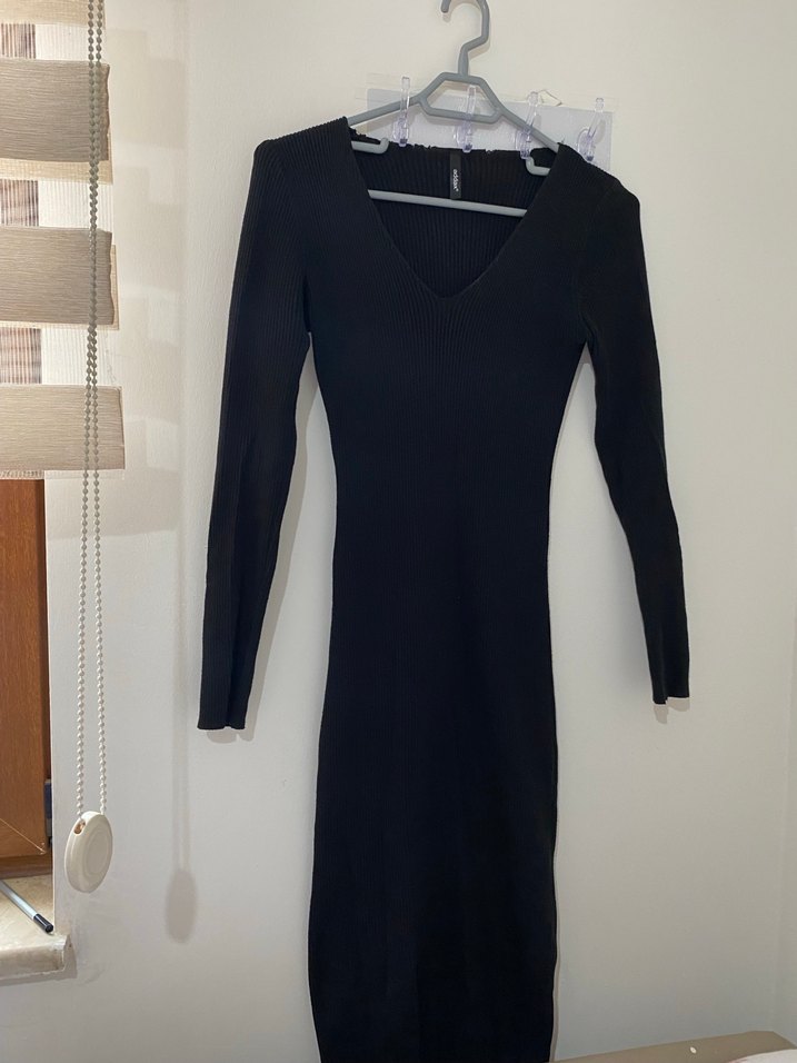 V yaka ve uzun kollu, vücuda oturan siyah triko elbise. Yumuşak sentetik kumaştan, uzun boy ve minimalist goth tarzıyla günlük kullanıma uygundur.