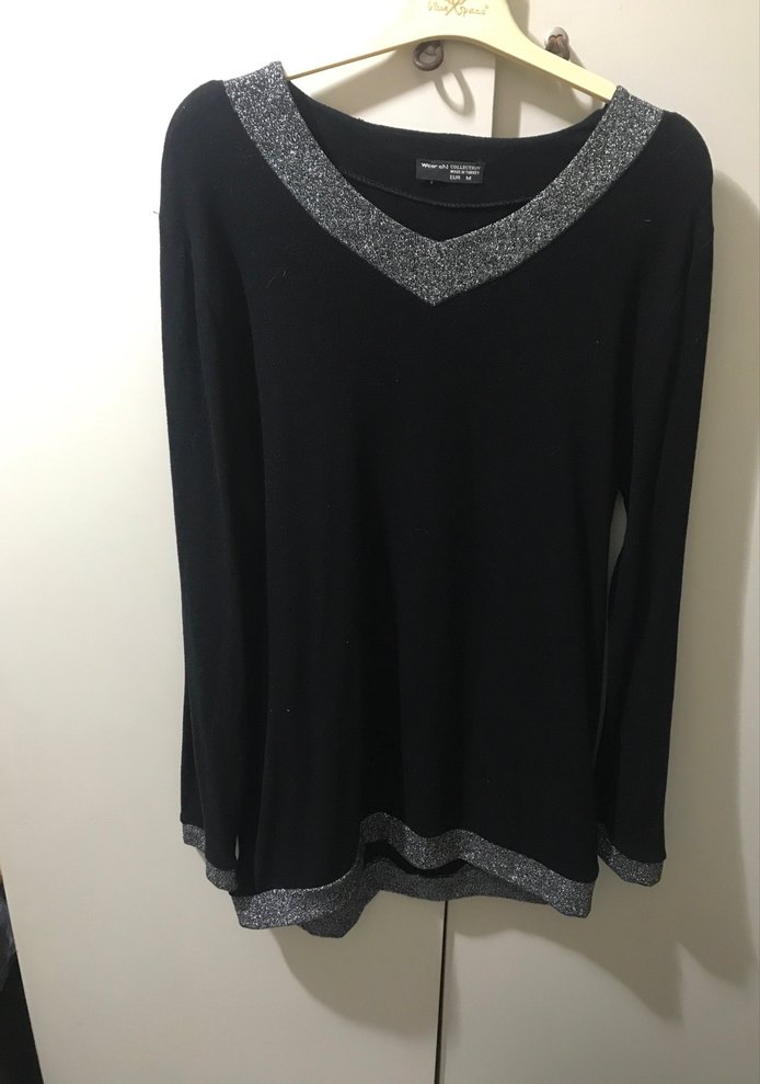 Siyah triko kazak, uzun kollu ve V yaka. Gümüş detaylı kenarlarıyla rahat ve salaş bir kesime sahip.