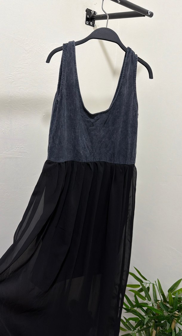Siyah uzun elbise, kolsuz ve bol kesimdir. Denim üst kısmı ve şeffaf etek kısmı ile gotik tarzda günlük kullanıma uygundur.