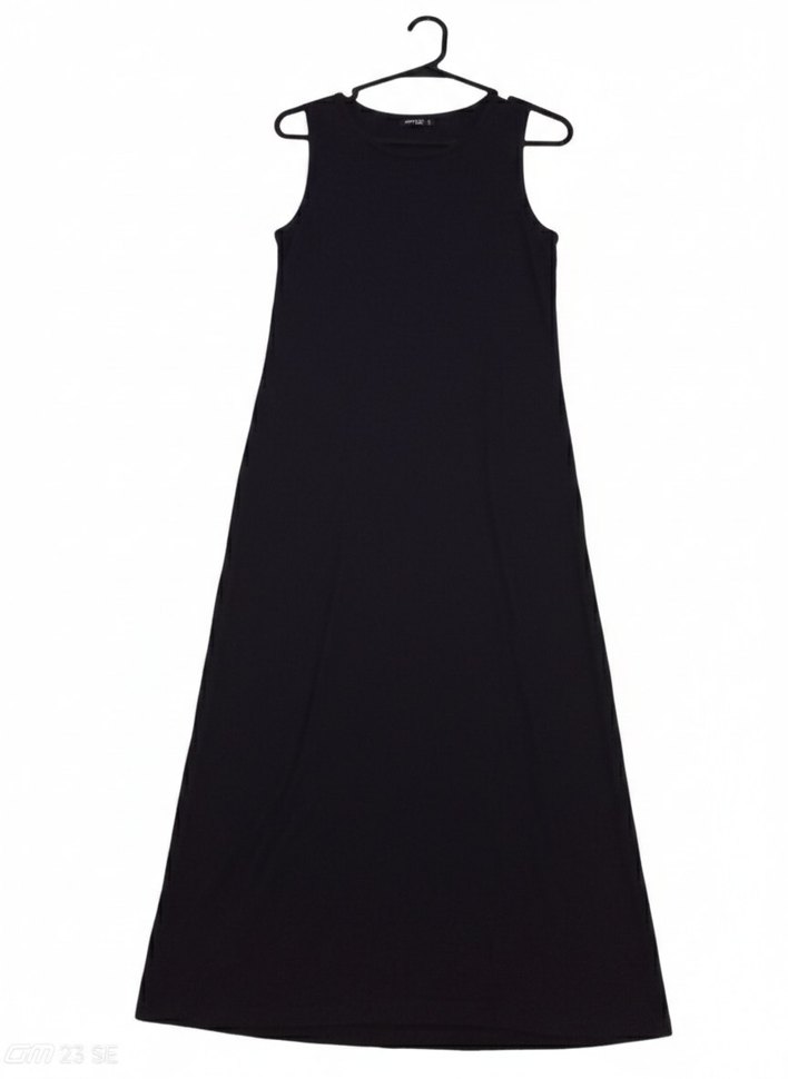Siyah uzun kolsuz elbise, V yakalı ve vücuda oturan kesime sahiptir. Dökümlü ve minimalist tarzda, ofis için uygundur.