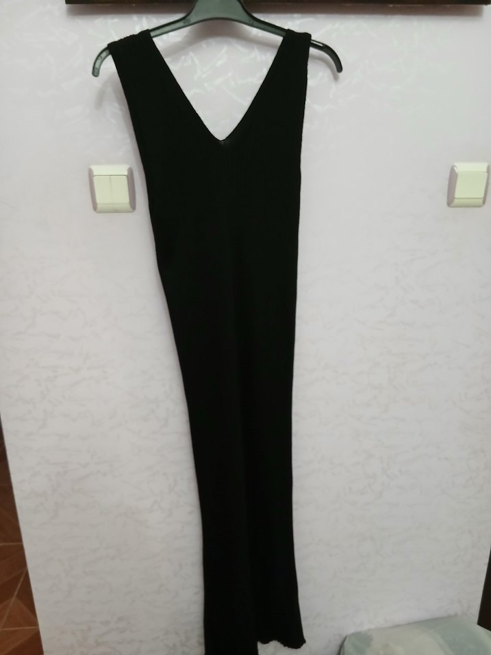 V yaka, kolsuz, siyah uzun elbise, ince oturan kesimiyle minimalist ve şık. Günlük kullanıma uygun, rahat sentetik kumaştan yapılmıştır.