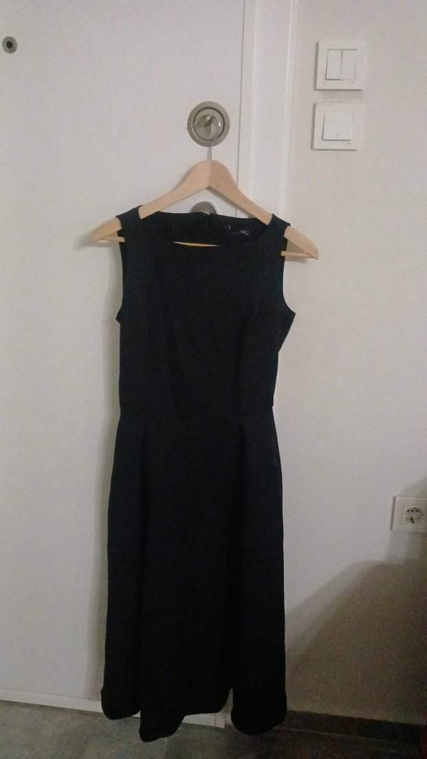 Siyah, kolsuz, V yakalı, drapeli ve uzun kesimli bu elbise, minimalist goth tarzıyla ofis kullanımı için uygundur.
