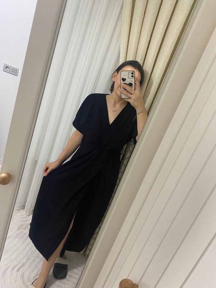 Siyah uzun elbise, salaş kesim ve drapeli tasarıma sahiptir. V yakalı ve ince askılı, ipeksi kumaştan üretilmiştir. Minimalist gotik tarzda, günlük kullanıma uygundur.