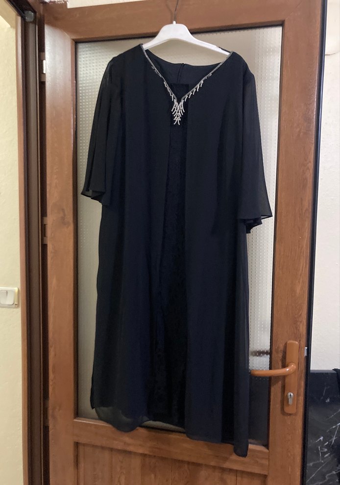 Siyah uzun, salaş kesim gece elbisesi, drapeli kısa kollu ve V yakalı, klasik gotik şıklığını yansıtıyor.