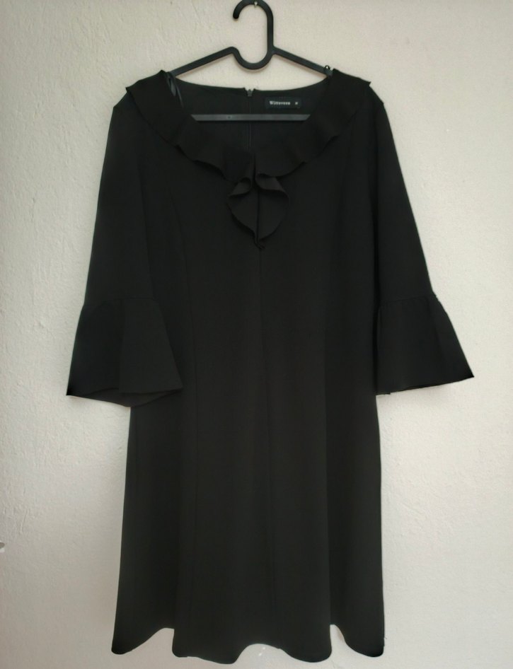 Siyah midi elbise, V yaka ve volan detaylı, uzun ve bol kollu, ofis için uygun.beden 38 yazıyor ama 40 bedene rahat olur likralı bi kumaşı vardır temiz bi ürün yurtdışından hediye geldi iki defa kullanıldı 4 mevsim kullanılabilir bi kumaş bence