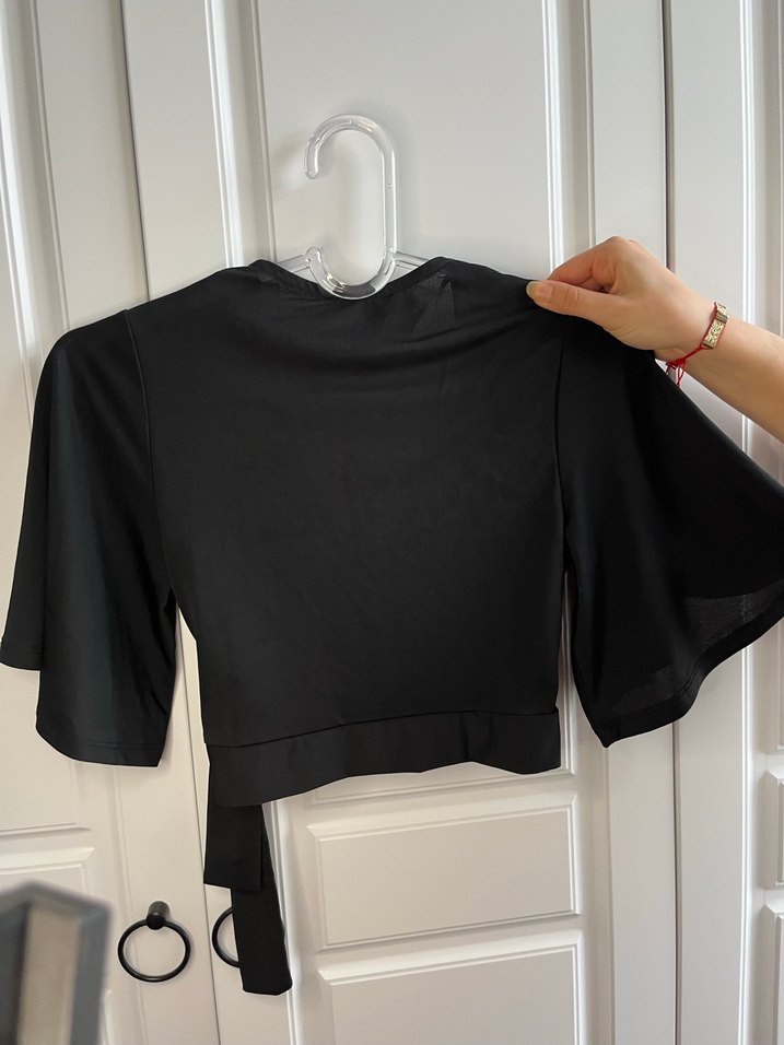 Siyah, V yakalı ve kısa kollu, yandan kuşak detayıyla minimalist ve şık görünümlü kadın bluz. Düz, sentetik kumaştan üretilmiştir, günlük kullanıma uygundur.