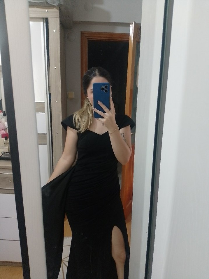 Siyah, v yaka, askılı kolları ve yırtmaç detaylı, ipeksi dokulu, midi boy dar kesim elbisedir. Gotik tarzda, romantik akşamlar için uygundur.