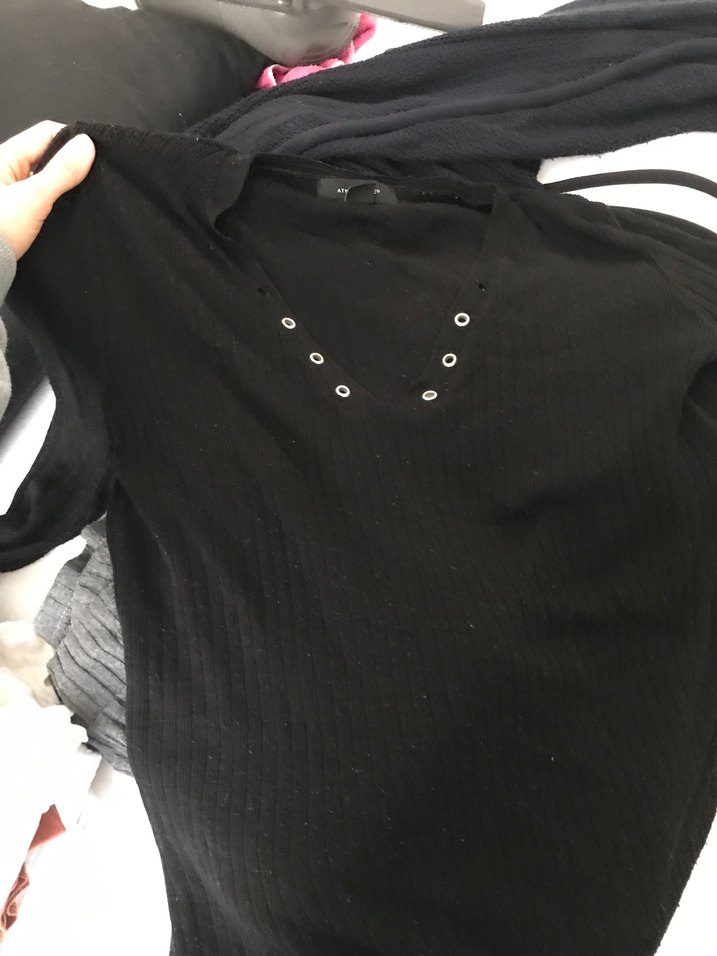 Düğmeli V yakalı, uzun kollu, siyah, ince ve esnek sentetik kumaştan, günlük rahat kullanım için uygundur.