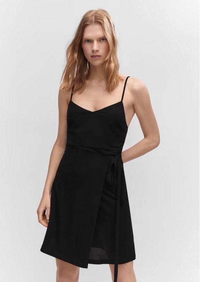 İnce ayarlamalı askılı, V yakalı, bağlamalı siyah midi elbise. M beden