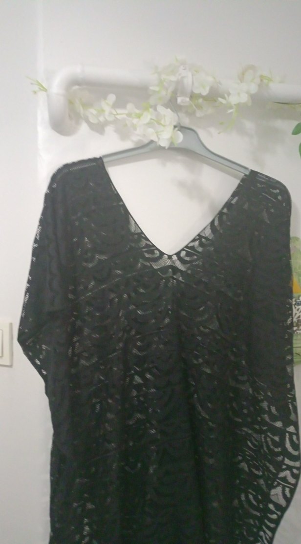 V yakalı, drapeli, siyah uzun kollu bohem tarzda, sentetik yumuşak kumaştan bol kesim plaj elbisesi gayet iyi durumda