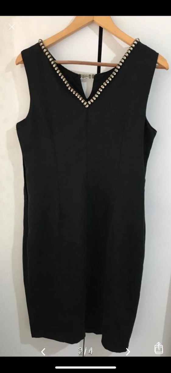 Boncuk işlemeli V yakalı, kolsuz, siyah midi elbise, minimalist gotik tarzıyla klasik şıklığı ofis ortamına taşıyor.