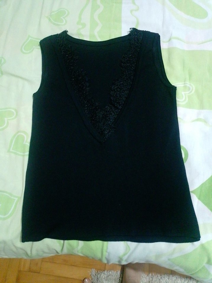Siyah, kolsuz kadın bluz V yakalı ve dantel detaylıdır. Normal midi boyda, sentetik yumuşak kumaştan olup, gotik tarzda şık ve rahat bir görünüme sahiptir.
